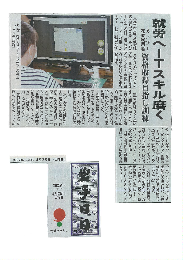 あいびー花巻では、4月から、文書入力や表計算、そして、簡単なゲームを制作できるプログラミング基礎やチラシなどのデザイン基礎など、パソコンを使ったITスキルの向上につなげられるよう「ITスキル訓練」を週1回のペースで開始しました