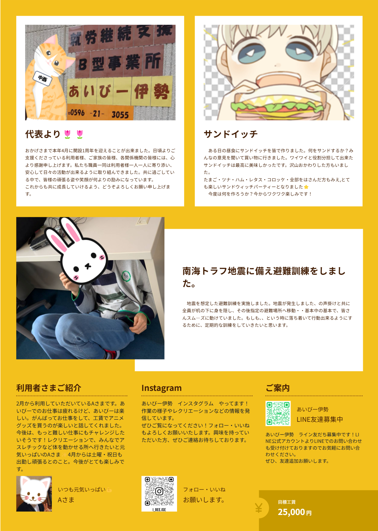2025年4月伊勢クリックで拡大できますこの会報誌を作成した事業所はこちらあいびー伊勢三重県伊勢市一之木1丁目14-19月曜日〜土曜日 10:00〜15:00あいびー伊勢の前後の会報誌2025年5月2025年3月