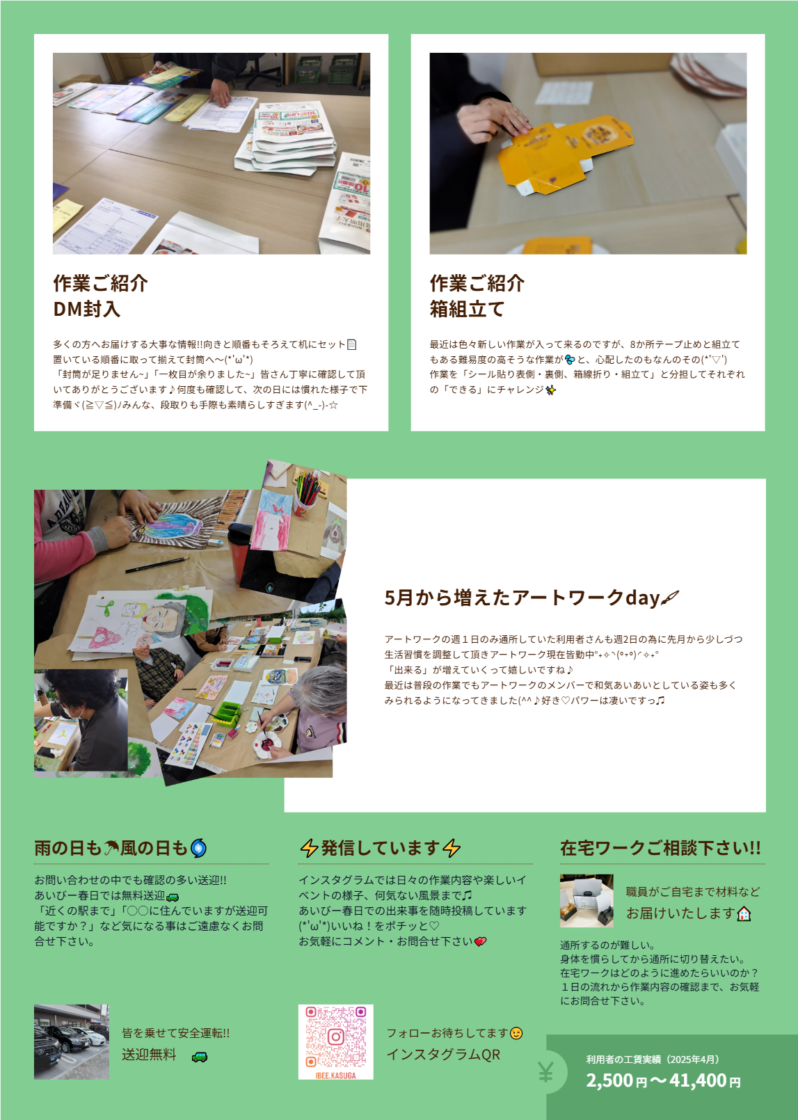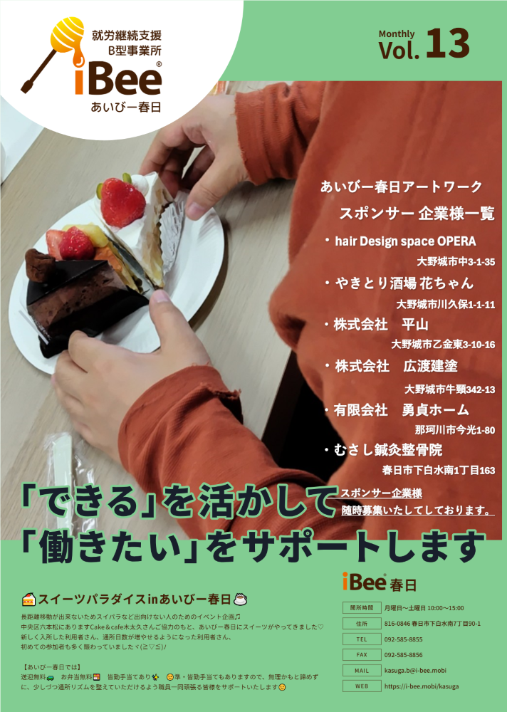 2025年5月春日クリックで拡大できますこの会報誌を作成した事業所はこちらあいびー春日福岡県春日市下白水南7丁目90-1月曜日〜土曜日 10:00〜15:00あいびー春日の前後の会報誌2025年7月2025年4月