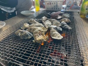 牡蠣焼きは初体験で、身がぎっしり詰まった熱々の牡蠣を口に運ぶと、