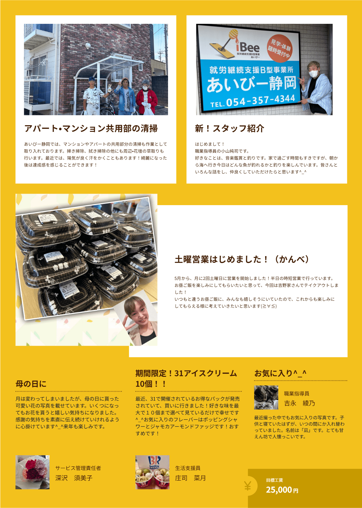 2025年6月静岡クリックで拡大できますこの会報誌を作成した事業所はこちらあいびー静岡静岡県静岡市清水区入江岡町1-8月曜日〜金曜日 10:00〜15:00あいびー静岡の前後の会報誌2025年8月2025年6月