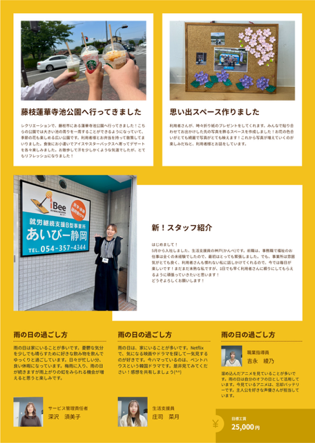 2024年6月静岡クリックで拡大できますこの会報誌を作成した事業所はこちらあいびー静岡静岡県静岡市清水区入江岡町1-8月曜日〜金曜日 10:00〜15:00あいびー静岡の前後の会報誌2024年8月2024年5月